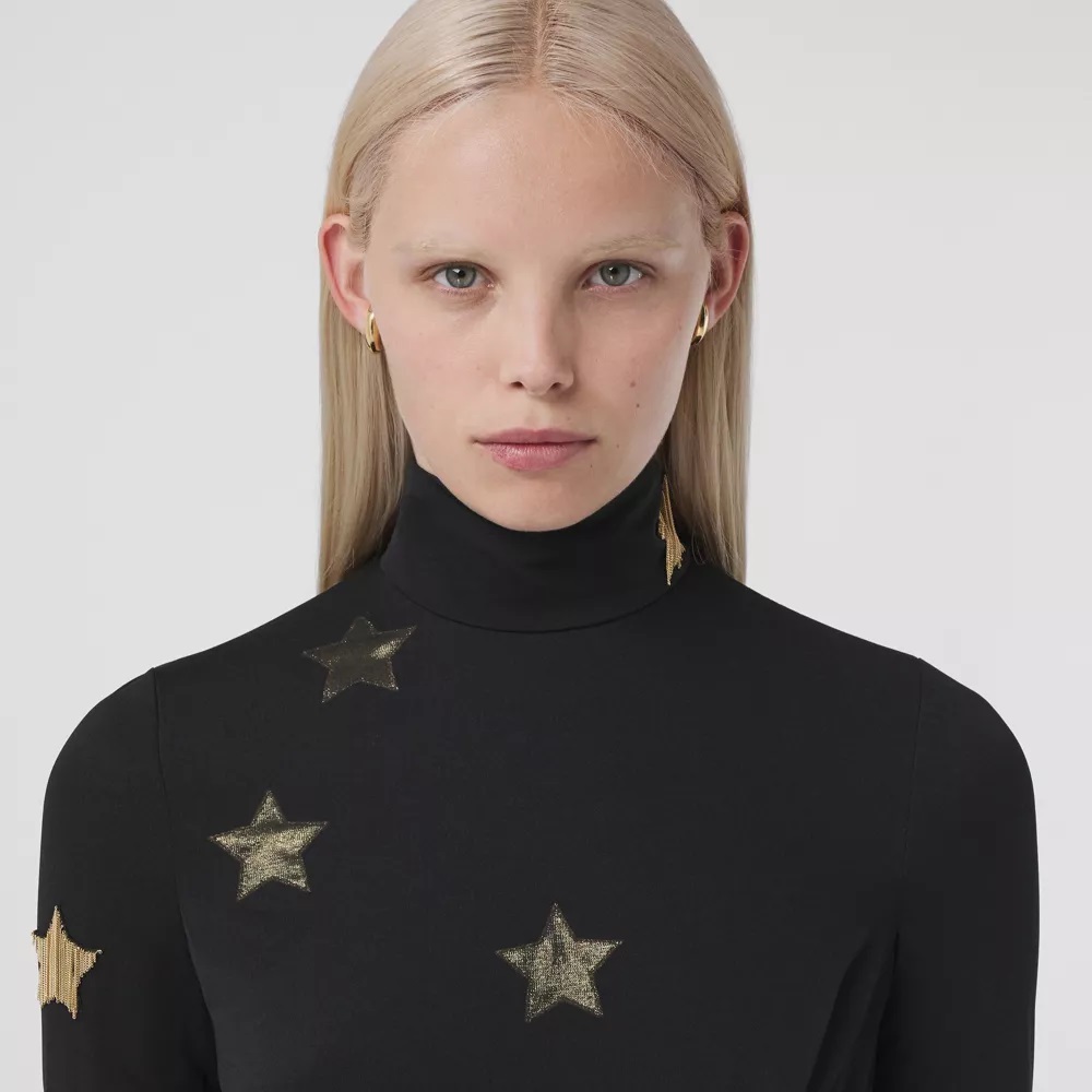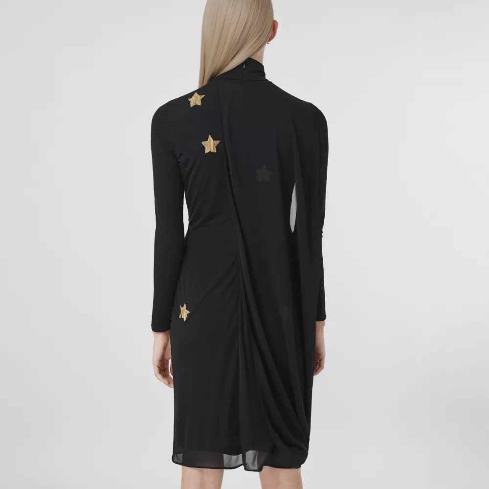 Long-sleeve-Star-Motif-Gathered-Silk-Viscose-Dress-Black